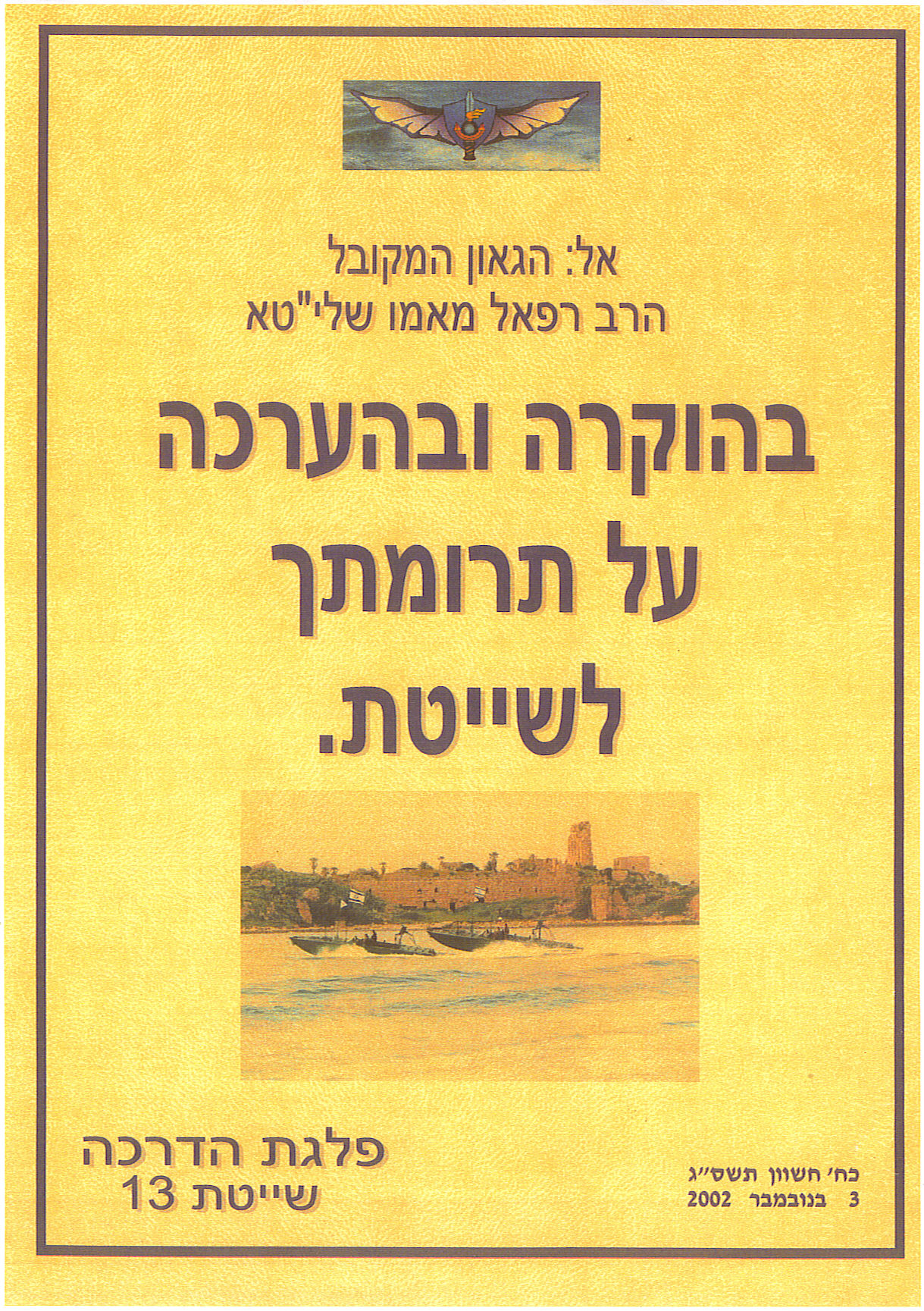 בשנת 2002, הוזמן כבוד מורנו ורבנו הגאון המקובל הרב רפאל מאמו שליט"א לבסיס שייטת 13 על מנת לברך את קציני ולוחמי השייטת, ולחזק את ידם בדברי תורה, דרך ארץ והקרבה למען עם ישראל וארץ ישראל.