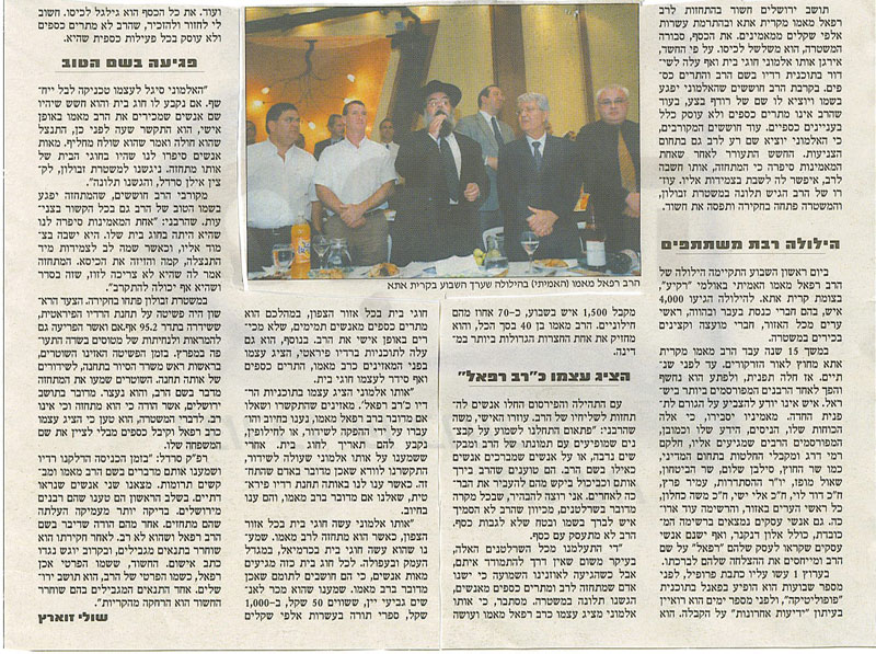 תושב ירושלים חשוד בהתחזות לרב רפאל מאמו מקרית אתא ובהתרמת עשרות אלפי שקלים ממאמינים. את הכסף, סבורה המשטרה, הוא משלשל לכיסו,על פי החשד, אירגן אותו אלמוגי חוגי בית ואף עלה לשידור בתוכנית רדיו בשם הרב והתרים כספים. בקרבת הרב חוששים שהאלמוני יפגע בשמו ויוציא לו שם של רודף בצע, בעוד שהרב אינו מתרים כספים ולא עוסק כלל בעניינים כספיים. עוד חוששים המקורבים, כי האלמוני יוציא שם רע לרב גם בתחום הצניעות. החשש התעורר לאחר שאחת המאמינות סיפרה כי המתחזה, אותו חשבה לרב, איפשר לה לשבת בצמידות אליו, עוזרו של הרב הגיש תלונה במשטרת זבולון, והמשטרה פתחה ותפסה את החשוד.
